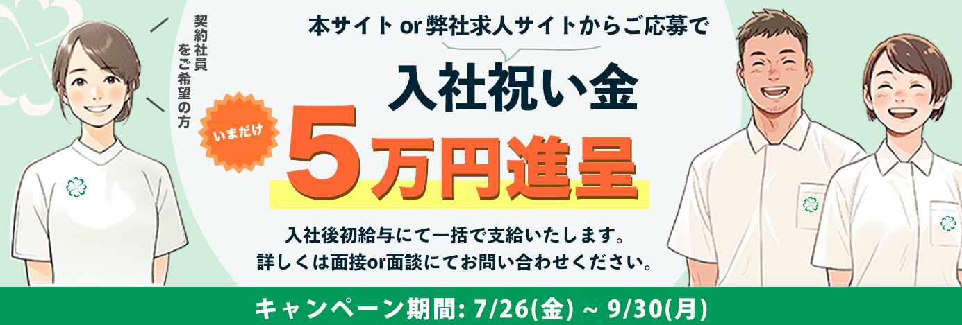 今なら!ご応募いただくと入社祝い金5万円プレゼント!! 入社後、初給与にて一括で支給します。
